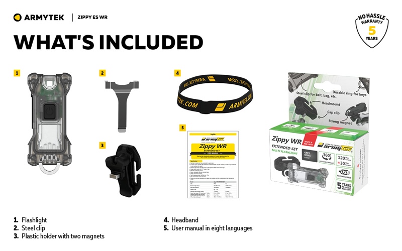 Set uključuje inovativni 360° rotirajući nosač za glavu sa jakim magnetom, metalnu klipsu i plastičnu kopču za montažu na kapu. Zahvaljujući ovom originalnom rešenju Zippi ES WR je pogodan za svakodnevnu primenu, servis automobila, popravke, kampovanje i bilo koju drugu svakodnevnu ili profesionalnu upotrebu.