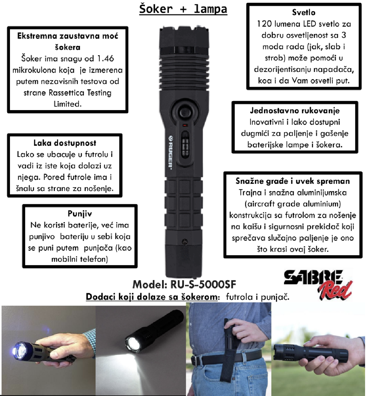 Dva uređaja u jednom, elektrošoker i lampa. Jačina elektrošokera je 1.46 mikrokulona dok je jačina lampe 120 lumena. Dolazi sa ugrađenom baterijom i futrolom.