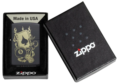 Uzmite sreću u svoje ruke ili džep sa ovim dizajnom za kockanje. Laserski ugravirani na Black Matte upaljač su brojni elementi inspirisani kazinom. Možete pronaći asa prostora, srećni broj 7, par kockica i još mnogo toga! Nosite ovaj upaljač sa sobom za malo sreće na sledećem putovanju u Grad greha. Dolazi upakovano u Zippo premium kutiju. Za optimalne performanse punite Zippo gorivo za upaljač.